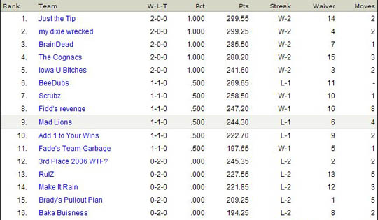 We’re in week 3 in the Ht Fantasy Football League. Week 3 is always make or break for a number of teams in the NFL, like the Eagles and Giants this year if they don’t win week 3 they are done. Same goes for a few people this year, with a shortened schedule for fantasy you only have a number of weeks to win your match-ups. On the bubble already are Speedy, Kenyon, Breathe, Cijid and Hojo with 0-2 starts. This shit just isn’t fair in a 16 team league especially with Lox’s autodraft team at 2-0. Next year we’ll have to do a money league to keep the number of entrants down. Well let’s see how Week 3 progresses…