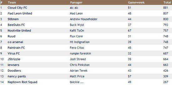Meanwhile in the Hostile EPL Alc continues to have decent days and keep his lead from the pack, that now is a 3 horse race with myself, MrBuzzcut and Buckwyld the only able to possibly overtake him. Meanwhile in the middle, Kart has a monstrous (fluke) week thanks to Blackburn’s Santa Cruz. The brothers Indig and Fero are separated by a lone point and may become the only tight race in the league. New additions Doodle, Val and Blackie all immediately have had decent teams so watch out for them next years pool or even in the Ultimate!
