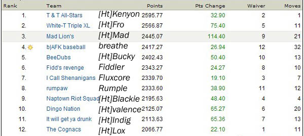 8th. Rumple has had the most movement throughout the standings, being in 1st for a few days, then slipping to third for most of the rest he’s slid out of contention lately. I dunno why, his teams pretty good and his players aren’t playing horribly. It could be a bit of team mis-management as this weeks line-up features an empty hole in his reliever spot and hot players like Gordon, Byrnes and Matthews Jr. all riding the pine.