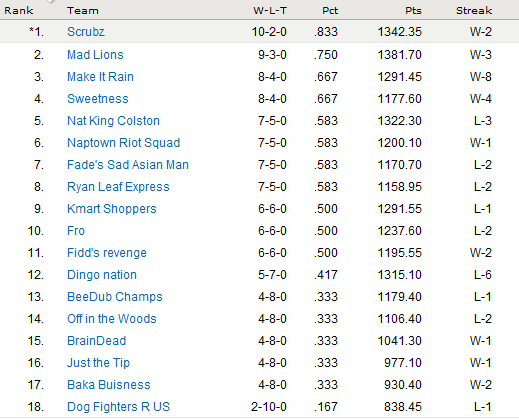 Here is how we stand after 12 weeks in the Free Ht Open FFL League. I’m sitting on top pretty much because of Boldin. Despite missing a few weeks due to that needless game out of reach freight train hit he took still leads the NFL WRs in fantasy points with our scoring system. I’m most likely going to take a loss to Fidd this week putting all 4 playoff spots still up for grabs. Mad has been holding down a steady second. Make It Rain, despite a 0-4 start, has won 8 straight and is tied for third with Burn (Sweetness). Plenty of teams still holding strong at 7-5 and it looks like it will be a interesting finish. Naptown Riot Squad got some bad news today as news made it around that Plaxico shot himself in the leg last night at a club, but PFT reports numerous sources claiming it will only be about 2 additional weeks missed. Don’t worry though, I’m well aware of the fuckup that Plaxico is off the field which is why I have had his replacement Hixon on my bench for weeks now.
