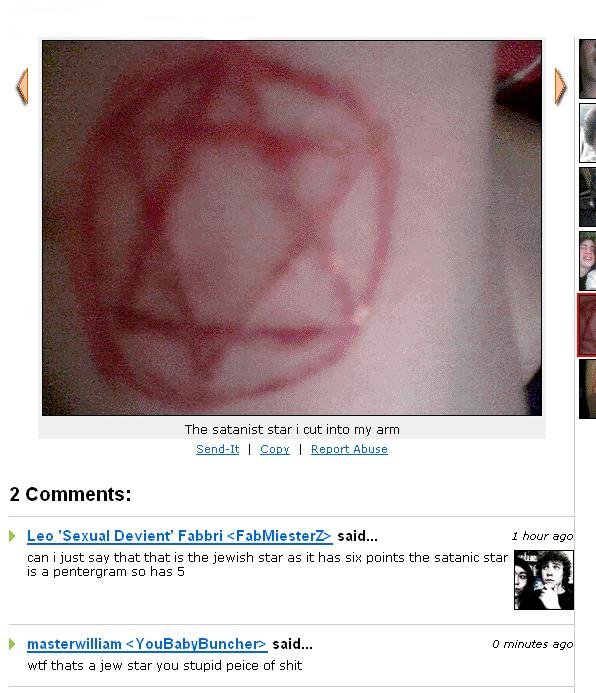 jew star, cousin bs looks like a troll, i believe tho that a dumbass kid would cut a jew star into their arm and brag about it.